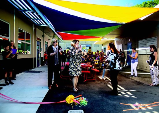 At a ribbon cutting ceremony for the new shade installation, House explained that most shade structures are installed with structural connections to the ground. Unfortunately, such structures start at about $20,000 and require additional expenditures for architects and soil engineers, he said. In order to use the grant to install some shade, House came up with the idea of shade sails that would be attached to the buildings and not the ground. The colorful sails which now form a permanent shade structure over the outdoor learning space came in at about $8,100.