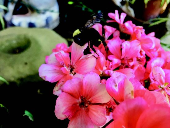 | Published August 7th, 2019 | Digging Deep with Goddess Gardener, Cynthia Brian | What's bugging you? | By Cynthia Brian |  | A bumble bee buzzes in a geranium. Photo Cynthia Brian | ". many plants of many kinds, with birds singing on the bushes, with various insects flitting about, and with worms crawling through the damp earth." - Charles Darwin