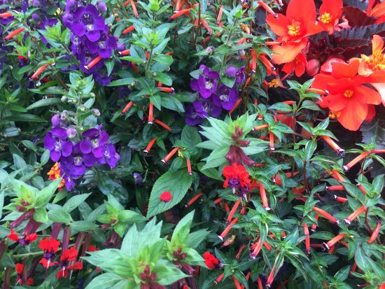 | A colorful collage of Cuphea, the cigar plant with Angelonia, and tuberous orange begonias. |