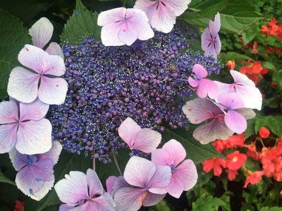 see the honeybee on this rare violet lace cap hydrangea.  |
