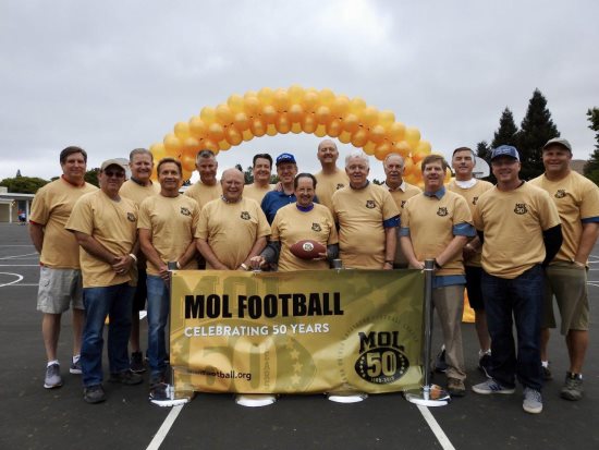 | Published October 2nd, 2019 | MOL celebrates 50th anniversary | | Submitted by Michael Sebree |  | Front row, fron left: Carl Bergez (representing League Honoree Doug Bergez), Brad Piatt, M.D., Dave Flett, George Oldenbourg, Bill Buehler, Bruce Burns, Steve Clark: back row: Mel Gilmour, Ted Haugner, Greg Young, Joe Cushing, Mike Sebree (current commissioner), Phil Estes, Yank Eppinger, Bill Fraser, Doug Pearson; not pictured: Greg and Hasmig Vasgerdsian representing Vic Vasgerdsian, Andy Eppinger, Tyler Petite and Drew Bennett, who were also present at the celebration. | On Sept, 7, MOL Flag Football celebrated its 50th Anniversary at Joaquin Moraga Middle School. What started out half a century ago as a simple idea for about a 70 local kids to play flag football together in the Fall, has grown into one of the country's largest not-for-profit, community-run, flag football programs with nearly 700 players this season. To help kick off the 50th season, MOL invited the League's original organizers, coaches, community leaders, players and key historic figures to come back and perform the coin toss for each of Saturday's games as well as join in activities with current players and coaches. MOL was honored that the League's founders (or their family's representatives) were all present for the celebration. | | | | | | | | | | | | | |