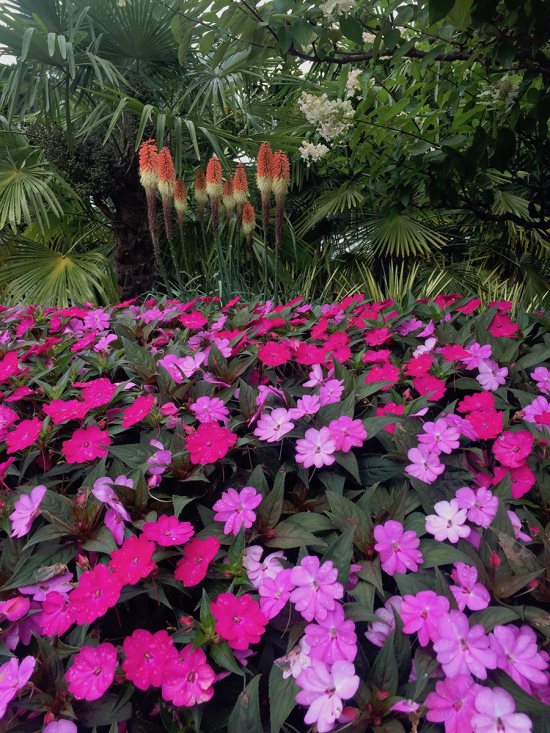 ADD a tropical ambiance with New Guinea impatiens, red-hot poker and palms.