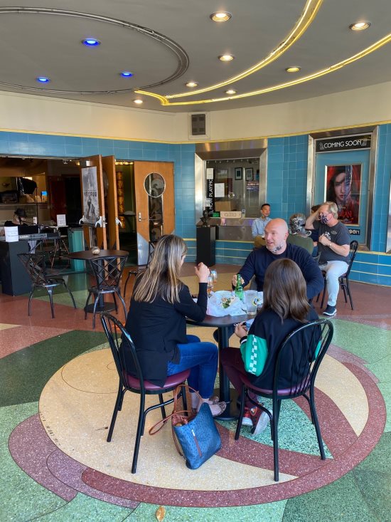Derek Zemrak, owner of the Orinda Theatre, Cine Cuvee, and Republic of Cake, has been organizing some entertainment under the theatre marquee on Fridays, Saturdays and Sundays. Cine Cuvee has moved all the interior tables and chairs to underneath the marquee and arranged them to enable social distancing. They encourage the wearing of masks and welcome food from other restaurants as long as customers purchase drinks from Cine Cuvee. On Sunday from 2 to 5 p.m. there is an open mic for singers from the Bay Area.