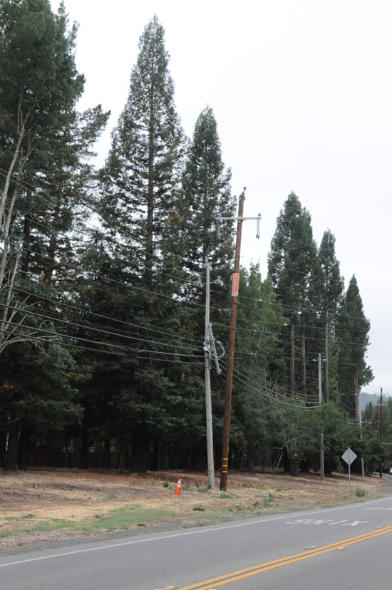 An old PG&E power pole, left, is dwarfed by a new one, right, along St. Mary's Road. Photo Andy Scheck