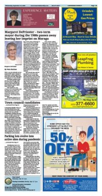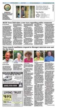 Page A 4 - A 5 MCSP Town Hall takes a new turn regarding public commentsTown council candidates respond to Moraga's interests now and for the futureMargaret DePriester - two-term mayor during the 1980s passes away leaving her imprint on Moraga