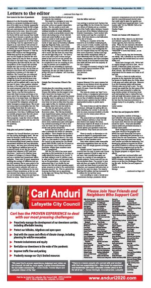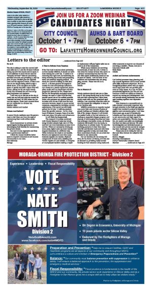 | Published September 30th, 2020 | Letters to the editor | | | | | Gina Dawson for City Council I am supporting Gina Dawson for Lafayette City Council as I have great confidence in Gina's abilities, work ethic and collaborative style. She has demonstrated her impressive skills through her work with the City Council and PGE on behalf of Save Lafayette Trees and the Lafayette Gas Safety Alliance. Gina does her homework and shows amazing knowledge of whatever the issue is, and however heated the discussion becomes she remains calm and professional. I agree with her goals for our City, which I am outlining here. For more details please go to Gina's website www.GinaDawson2020.com Gina will continue to work to hold our public utilities accountable, supports safe bike and pedestrian paths and emergency preparedness. Gina is an advocate for affordable and inclusive housing opportunities as part of the General Plan update and of monitoring State housing legislation. Gina will continue to work on protecting our open spaces and tree canopy, and advocates for one or more downtown parks. Gina will collaborate with the Chamber of Commerce and business community to accelerate business recovery and downtown revitalization. As a longtime member of Sustainable Lafayette, Gina supports environmental programs and strategies promoting a sustainable community. Gina Dawson would be a great and hard- working asset to our City as a member of the Lafayette City Council. Alison Hill Lafayette resident for 51 years Downtown development opportunities In the 25 years since I first laid eyes on Orinda, not much has changed! When my family moved here and I started attending Glorietta Elementary, Theatre Square was newly redeveloped. The new library and redevelopment of its former site are the only significant changes I have seen since. There's nothing really wrong with Orinda having stayed so sleepy, except it's a bit out of touch with what's happening in our region. In these last 25 years, the Bay Area has grown by almost 1.5 million residents! Just looking down the road to Lafayette or Walnut Creek, you can see dozens of new shops and apartment buildings have popped up gradually over the years, creating vibrant downtowns. On the topic of housing in particular, all we know is we have not been building enough! In the past 10 years, you can't get away from headlines about the new extremes of California's housing supply shortage. With a new study showing 52% of 18- to 29-year-olds are now living with their parents, it couldn't be a better time to update Orinda's zoning plans to allow for more diverse housing options along with commercial development. We need housing for these younger folks and for empty nesters looking to downsize. We should have those options in our downtown close to the BART station and shops. We should also be asking ourselves whether the justifications for not allowing new housing construction downtown are actually based on a legacy of racism that pushes new infill housing development into more disadvantaged communities, causing displacement. Ultimately, downtown Orinda will not stay sleepy forever. With proposed state legislation such as this year's SB50, it's only a matter of time before BART station neighborhoods are automatically "upzoned." Developers won't have to wait to hear what locals think. If Orinda residents want to take control of how their town will look, they should take the time now to implement thoughtful guidelines for how that denser infill should look and incorporate strategies to meet local needs while also creating a more beautiful, inclusive, and walkable place with new homes and businesses. Thomas Gonzales Orinda A vote for David Stromberg I support David Stromberg for Moraga Town Council. I have worked with David on the Planning Commission for three years and know he has the necessary governing experience, objectivity, and analytical skills to be an effective Councilmember. David has impressive experience in public service in Moraga. He served on the Design Review Board; is a Moraga Community Foundation Boardmember; and has been the Planning Commission Chairperson for two years. He provided careful analysis on the Citizens Advisory Committee to finalize the MCSP. As a business mediator and attorney with expertise in dispute resolution, David approaches contentious issues by carefully listening to and identifying the merits of competing perspectives and then working collaboratively to achieve a consensus. His unique skill will be an invaluable contribution to the Council as he tackles the complicated issues and projects in Moraga. As a Councilmember, David will devote himself to promoting the core values that we all support: maintaining our beautiful open space; ensuring managed growth; pursuing sound fiscal management policies; and protecting our safety. I urge all Moragans to visit David's website to learn and appreciate the difference he will make as our Councilmember. www.stromberg2020.com Brenda Luster Planning Commission Vice Chair and Moraga resident Measure R is NOT a Road Tax Measure R is a general tax, and by law cannot be specified. The Orinda city council plan and the campaign literature, which by law CAN state the intentions, is to front-load fire prevention for the first five years, with roads/storm drains maintained. As road work needs increase and needs for heavy duty fire prevention decrease, priorities would be rebalanced. Written assurances from Mayor Gee and Councilmember Fay state this. A citizen oversight committee will insure the revenue is spent as intended. Saferorinda.org outlines the plan. We see, breathe and read every day that wildfires are increasing. As a result the homeowners insurance market is collapsing. Insurance companies now look at whole neighborhoods and towns. AND they are looking at infrastructure to determine the potential for wildfire survival. Measure R is actually an integrated fire prevention plan that will give us some ability to