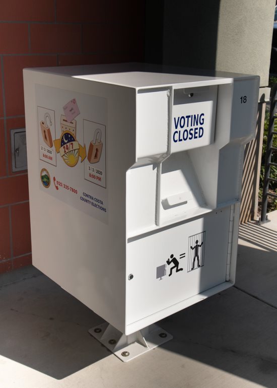 The county is making it even easier to vote this year. Secure locked ballot drop boxes are increasing from 12 to 43. In Lamorinda, these secure ballot boxes are located at the Lafayette School District Office, the Albert Hall Library at Saint Mary's College in Moraga and at Orinda City Hall. There are many other secure locked ballot boxes throughout the county, including the Contra Costa County Clerk-Recorder-Elections Office at 555 Escobar St. in Martinez.