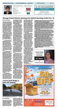 Page A 4 - A 5 Town council reviews MCSPMoraga earns No. 8 ranking of 50 Safest College Towns in AmericaMoraga School District phasing into hybrid learning model Nov. 16Canyon Road Bridge to have soft opening
