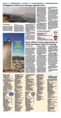 Page A 8 and A9Firefighters crush 30-acre Moraga vegetation fireMOFD official renders split decision in PG&E-San Ramon Valley Fire hearingLafayette Police BlotterMoraga Police BlotterOrinda Police BlotterLetters to the editor