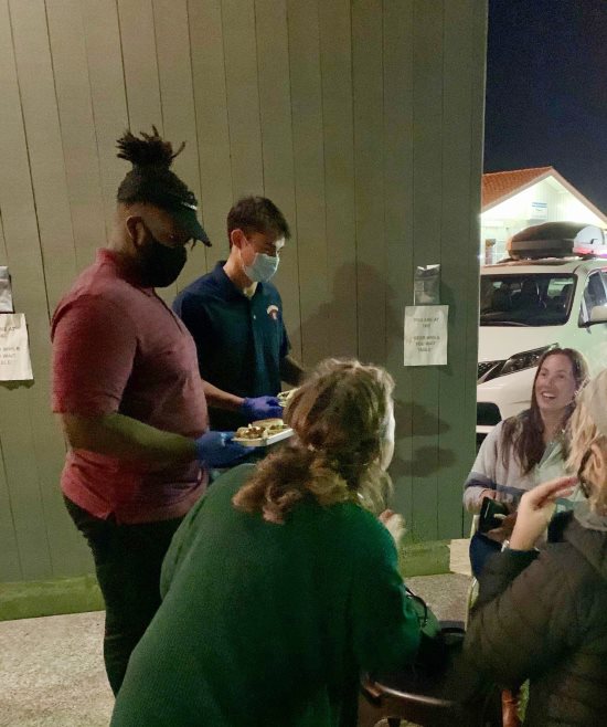 | | Varsity lineman Matai Bell and wide receiver Maxwell Weaver, both seniors at Campo, serve food to guests in the front of Canyon Club Brewery. Photo Lauren Fritch | | | | | | This past spring, racial incidents and videos by some Campolindo students became public and caused an uproar. Since then, the schools in the Acalanes Union High School District created a Diversity and Inclusion program, and on Oct. 26 the Campolindo Football Team and the Campolindo Football Moms for Diversity joined up for a fundraiser at the Canyon Club Brewery to raise money and awareness for the program.
