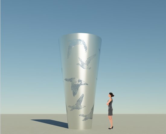 Loria took the council through a series of slides showing some of those projects. The Lennar Homes site - the three-story, residential and retail project at 3666 Mt. Diablo Blvd. at the intersection of Dolores Road - will have two projects. The first, a large 12-foot tall, conical shaped, stainless steel, laser-etched sculpture, with a low energy LED lighting feature illuminating a pattern of migratory birds will be located in the public plaza between retail space and a restaurant. Currently final adjustments are being made to the design, which will be subject to PAC approval. It is the work of design team Wowhaus, which has worked on projects in Oakland, Walnut Creek, Seattle and Boston.