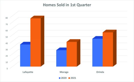 Of the 76 single-family home sales that closed in Lafayette in the first quarter of 2020, 53 sold at or above the list price. In Moraga, 30 of the 39 sales were at or above the asking price and in Orinda, 37 of the 54 sold at or above the final listing price.