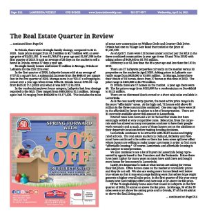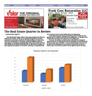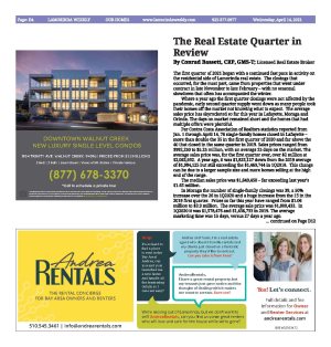 | Published April 14th, 2021 | The Real Estate Quarter in Review | | By Conrad Bassett, CRP, GMS-T; Licensed Real Estate Broker |  | | The first quarter of 2021 began with a continued fast pace in activity on the residential side of Lamorinda real estate. The closings that occurred, for the most part, came from properties that went under contract in late November to late February - with no seasonal slowdown that often has accompanied the winter.