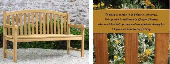 The bench will bear a plaque that will say something very like, "`To plant a garden is to believe in tomorrow.' This Garden is dedicated to Kirsten Theurer, who nourished this garden and our students during her 14 years as Principal of Del Rey."