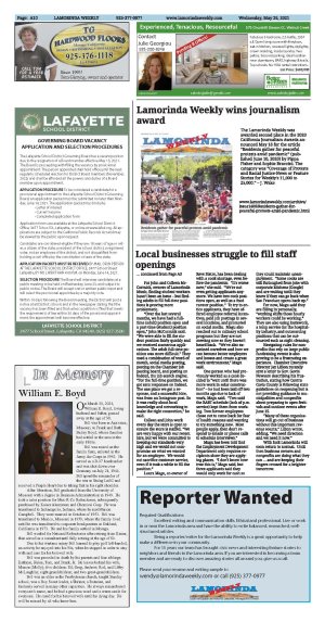 | Published May 26th, 2021 | Local businesses struggle to fill staff openings | | By Jennifer Wake |  | "Help Wanted" signs grace several local businesses in Lafayette. Reve Bistro on Moraga Road has two cook openings. Photo J. Wake | Reopening businesses following the relaxation of strict COVID-19 regulations isn't always as simple as reopening doors to the establishment - especially for those in the hospitality industry. Local business owners are finding it difficult to fill positions while navigating shifting county and state rules about the pandemic.