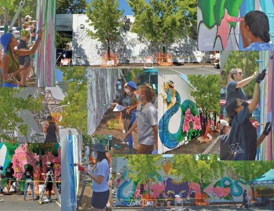 "I think we successfully accomplished the mission with this mural in Lafayette," said Loring, "and we look forward to more collaborations in the community!" |  | | An army of artistic volunteers work on new Lafayette mural. Photo provided | | | | | | | | | | | |