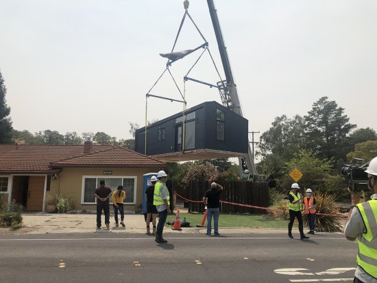 The shrink wrapped one-bedroom unit, which was built at an off-site location in Utah, arrived on a flatbed truck on the quiet street. A large crane stood ready to lift the ADU into place on its foundation built in the homeowner's backyard.