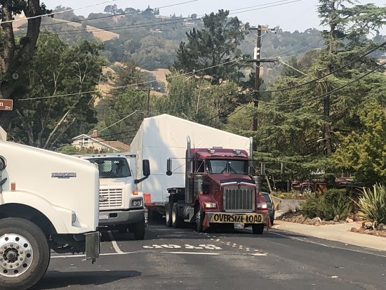 Some neighbors stayed glued to their seats, while others took peeks into the backyard after the lift-off took place. "My mom was sad to miss the drop," Bhathena said. "She'll be moving in September and the unit will be ready for her." |  | | The shrink-wrapped ADU arrives on Stanley Boulevard. |  | | Georgette Bhathena with dog, Rosie. | | | | | | | | | |