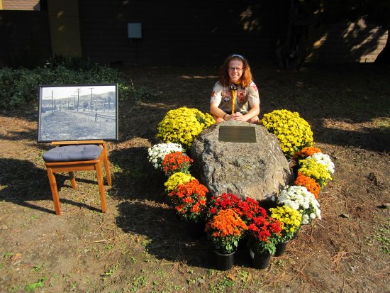 | | Troop 212 Eagle Scout, Mason Fara, commemorates historic site of Moraga Train Station location Photo Vera Kochan | | | | | | There are no remnants of a train station, let alone any railroad tracks, to mark the existence of the Moraga Station. However, that fact did not deter Eagle Scout Mason Fara of Troop 212 from pursuing his project to acknowledge the location and install a commemorative plaque behind Outdoor Supply Hardware (OSH) and across Viader Drive (originally known as Railroad Avenue) from the Moraga Barn.
