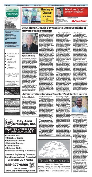 | Published January 5th, 2022 | New Mayor Dennis Fay wants to improve plight of private roads residents | | By Sora O'Doherty |  | Mayor Dennis Fay Lamo archive | As he enters the last year of his term on the Orinda City Council as mayor, Dennis Fay would like to do something to help residents of private streets not in homeowners associations. He would like to get a pilot program started this year to work with residents to bring their streets up to standard and then have those streets accepted by the city of Orinda. However, he is only talking about a specific segment of Orinda's approximately 20% of streets that are private. In fact, he is looking at helping residents on perhaps 25% of those streets, or about 5% of Orinda's streets in total.