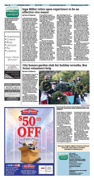 | Published January 19th, 2022 | City honors garden club for holiday wreaths, Boy Scout volunteers help | | By Sora O'Doherty |  | Scout Troop 237, back row, from left: Michael Robinson, Ben Hollerbach, Grayson Bloes, Hayden MacKenzie; front: Louie Windhurst Photo Sora O'Doherty | Boy Scouts from Troop 237 on Jan. 9 assisted the Orinda Garden Club by taking down the 60 wreaths that had brightened downtown Orinda over the holidays, and on Jan. 11, the city council honored the club with a certificate of recognition for the holiday wreath program. In introducing the matter, Mayor Dennis Fay commented that his family had guests in town over the holidays and they were very impressed by the wreaths.