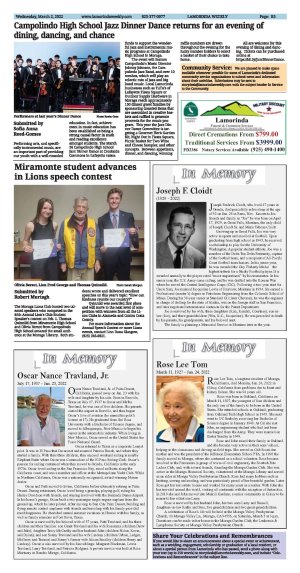| Published March 2nd, 2022 | Joseph F. Cloidt | | |  | (1929 - 2022) | Joseph Fredrick Cloidt, who lived 47 years in Orinda, died peacefully in his sleep at the age of 92 on Jan. 26 in Reno, Nev. Known to his friends and family as "Joe" he was born on April 17, 1929, in Great Falls, Montana, the only child of Joseph Cloidt Sr. and Marie Tebeau Cloidt.