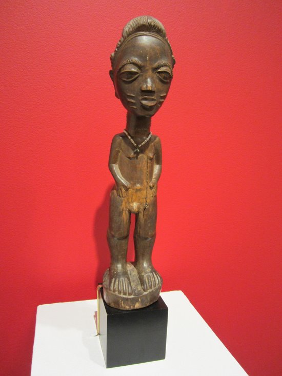 Seventeen tribes are represented through the 18th, 19th and 20th century artifacts in the exhibit, and while they can be considered works of art, the original intent of many of the pieces was to serve a spiritual or medicinal purpose. One such piece from mid-20th century Ghana is a fertility statue ("Akua Ba" meaning Akua`s Child) made of wood, glass and beads. Royer explained that it was commissioned by an infertile woman who was instructed by a priest to carry it on her back the way one would carry a baby. Even though Akua was mocked by fellow villagers, eventually the woman did conceive a child. Other women of the tribe began to adopt the practice.