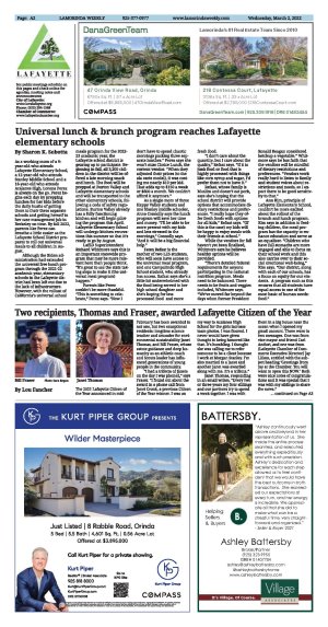 Although the Biden administration had extended the universal free lunch program through the 2021-22 academic year, elementary schools in the Lafayette district had been left out due to the lack of infrastructure. However, with the rollout of California's universal school meals program for the 2022-23 academic year, the Lafayette school district is gearing up to participate. Beginning in fall, all 3,200 children in the district will be offered a late morning snack and lunch. The food will be prepped at Burton Valley and Lafayette elementary schools and will be transported to the other elementary schools, following a code of safety regulations. Burton Valley already has a fully functioning kitchen and will begin piloting the program this April. Lafayette Elementary School will undergo kitchen renovations this summer so that it's ready to go by August.