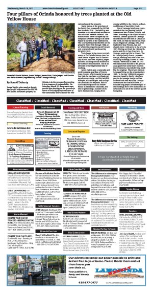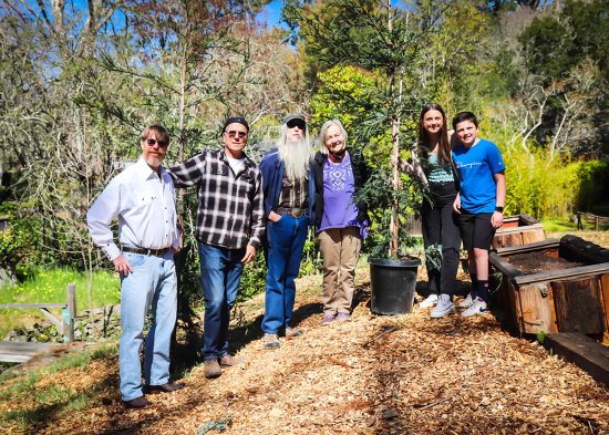 | Published March 16th, 2022 | Four pillars of Orinda honored by trees planted at the Old Yellow House | | By Sora O'Doherty |  | From left: David Nelson, James Wright, James Hale, Toris Jaeger, and Natalie and Peter Stewart (representing the de Laveaga family). Photo Sora O'Doherty | James Wright, who nearly a decade ago bought and restored the Old Yellow House, an historic property in Orinda, is in the process of converting it to a museum of sustainability. On Saturday, March 12, there was a ceremonial tree planting on the grounds in honor of four significant members of the community and to launch the educational use of the property.