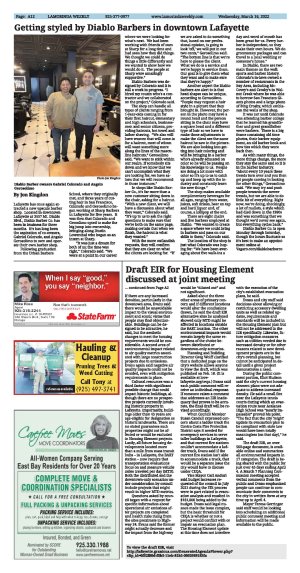 | Published March 16th, 2022 | Getting styled by Diablo Barbers in downtown Lafayette | | By Jon Kingdon |  | Diablo Barber owners Gabriel Colorado and Angelo Gerosolimo Photo Jon Kingdon | Lafayette has once again attracted a new upscale barber shop. Located in downtown Lafayette at 3557 Mt. Diablo Blvd., Diablo Barber Co. has been in business for three months. It's has long been the aspiration of co-owners, Gabriel Colorado, and Angelo Gerosolimo to own and operate their own barber shop.