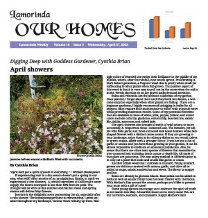 | Published April 27th, 2022 | Digging Deep with Goddess Gardener, Cynthia Brian | April showers | By Cynthia Brian |  | Jasmine twines around a birdbath filled with succulents. Photo Cynthia Brian | "April hath put a spirit of youth in everything." ~ William Shakespeare