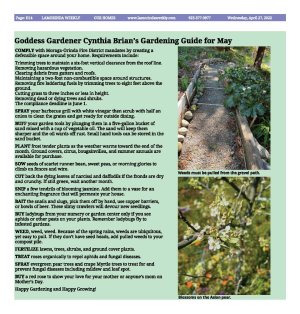 Happy Gardening and Happy Growing! |  | Weeds must be pulled from the gravel path. Photo Cynthia Brian |  | Blossoms on the Asian pear. Photo Cynthia Brian |  | Roses climbing an arbor. Photo Cynthia Brian |  | The bright pink blooms of a flowering cheery illuminate the landscape. Photo Cynthia Brian |  | Cynthia Brian is elated about the rain! Cynthia Brian, The Goddess Gardener, is available for hire to help you prepare for your spring garden. Raised in the vineyards of Napa County, Cynthia is a New York Times best-selling author, actor, radio personality, speaker, media and writing coach as well as the Founder and Executive Director of Be the Star You Are!r 501 c3. Tune into Cynthia's StarStyler Radio Broadcast at www.StarStyleRadio.com. Buy copies of her books, including, Chicken Soup for the Gardener's Soul, Growing with the Goddess Gardener, and Be the Star You Are! www.cynthiabrian.com/online-store. Receive a FREE inspirational music DVD and special savings. Hire Cynthia for writing projects, garden consults, and inspirational lectures. Cynthia@GoddessGardener.com www.GoddessGardener.com | | | |