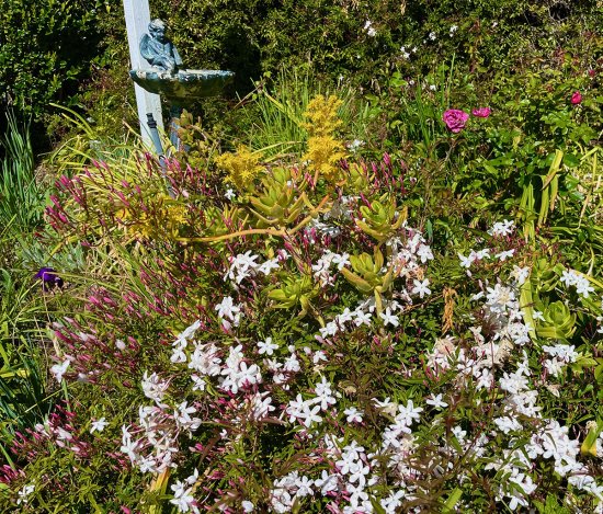 Jasmine twines around a birdbath filled with succulents. Photo Cynthia Brian