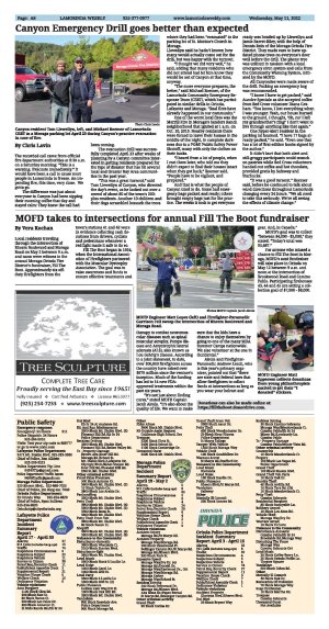 | Published May 11th, 2022 | Canyon Emergency Drill goes better than expected | | By Chris Lavin |  | Canyon resident Tom Llewellyn, left, and Michael Roemer of Lamorinda CERT in a Moraga parking lot April 23 during Canyon's practice evacuation in case of fire. Photo Chris Lavin | The recorded call came from official fire department authorities at 8:30 a.m. on a Saturday morning: "This is a warning. Evacuate immediately." It would have been a call to cause most people in Lamorinda to freeze. An impending fire, this time, very close. We gotta go.