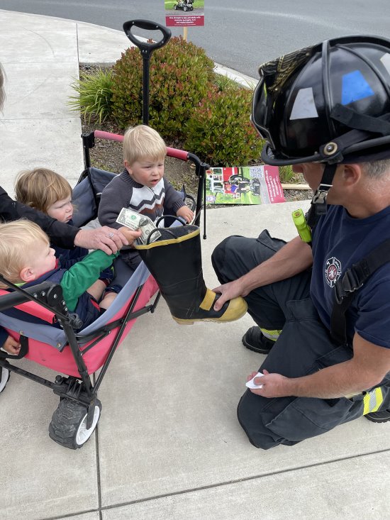 MOFD Engineer Matt Epperson collects donations from young philanthropists excited to get their "I donated" stickers. Photos MOFD Captain Jacob Airola