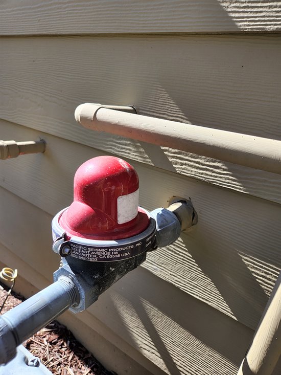 One other component your gas main might have is a seismic sensing shutoff valve. These are not on every home yet, but many homes in earthquake country have them. You will know quickly if you do because its red color stands out. It might be a rectangular box or a round, bell shaped object located in the gas line after the meter but before the point that the line enters the house. Bell or box, they essentially work the same way, when the ground moves sufficiently, they activate and stop the flow of gas to the house. When this happens, it can easily be reset with a flat head screwdriver. Find the little reset screw on the side of the mechanism and give it a 1/4 turn to reset, (don't try to unscrew it). If there was a hefty earthquake, make sure that there was no damage to the gas lines in your house before you reset this device.