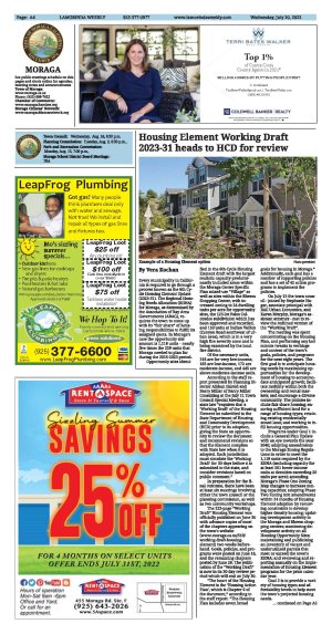 | Published July 20th, 2022 | Housing Element Working Draft 2023-31 heads to HCD for review | | By Vera Kochan |  | Example of a Housing Element option Photo provided | Every municipality in California is required to go through a process known as the 6th Cycle Housing Element Update (2023-31). The Regional Housing Needs Allocation (RHNA) for Moraga, as determined by the Association of Bay Area Governments (ABAG), requires the town to come up with its "fair share" of housing responsibilities to fulfill its assigned quota. In Moraga's case the opportunity site amount is 1,118 units - nearly five times the 229 units that Moraga needed to plan for during the 2015-2023 period.