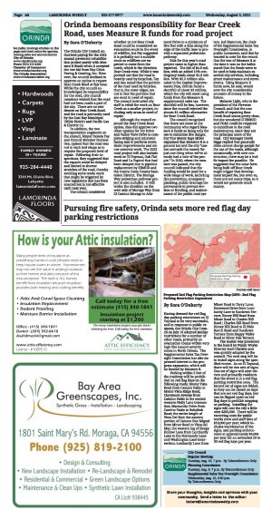 | Published August 3rd, 2022 | Orinda bemoans responsibility for Bear Creek Road, uses Measure R funds for road project | | By Sora O'Doherty | | | The Orinda City Council authorized paying for the 2022 annual pavement rehabilitation project partly with Measure R funds when it accepted the low bid from Bay Cities Paving & Grading, Inc. However, the council declined to approve an option to repave Bear Creek Road at this time. While the city council acknowledged its responsibility for the road, city council members wished that the road had not been made a part of the city. There are no residences on Bear Creek Road, and the road is primarily used by the East Bay Municipal Utility District and Pacific Gas & Electric Co.