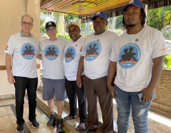 | | LCL leadership team, from left: Alex Cobo, Contractor & Consultant from Florida; co-founders Paul Freedman and Goma Rotarian Fidel Bafilemba; local contractor and Goma Rotarian Placide Mumbere, BEL board member and computer scientist Michael Bafilemba; all wearing groundbreaking ceremonial shirts. Photo provided | | | | | | Construction for a new library and learning center for children in Goma, Democratic Republic of Congo (DRC) commenced recently, with a groundbreaking ceremony attended by people from California, Florida, and Eastern Congo. After 7 years of planning, The Lumumba Children's Library and Learning Center (LCL) is becoming a reality for co-founders Paul Freedman and Fidel Bafilemba, past president of Rotary Club of Goma-Tumaini.