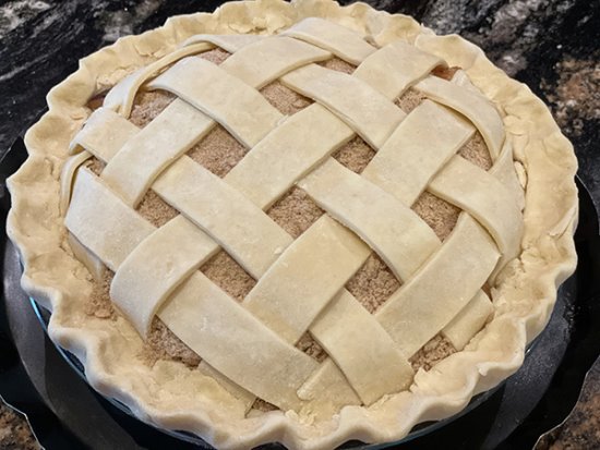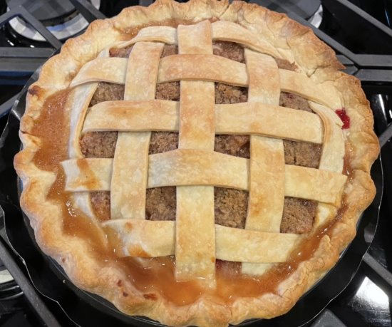 Turn the prepared fruit mixture into the pie dish, right on top of the bottom crust, and spread out evenly into the dish. Sprinkle crumb topping mixture over the top of the fruit. Now, weave the lattice crust pieces over the crumb topping and roll the excess dough from the bottom crust over the top of the lattice edges, and roll into a nice even edge. Crimp or flute the edges of the bottom crust so that the lattice crust edges are tucked inside.