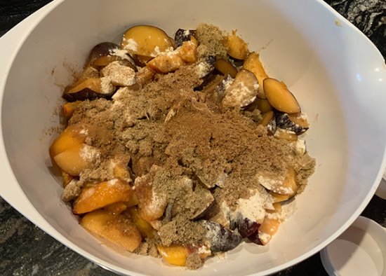 In a separate bowl, mix brown sugar, cornstarch, salt and spices until blended. Then gently toss peaches and plums with brown sugar mixture, being sure to coat the fruit well. Stir in 1/4 cup of the crumb topping.