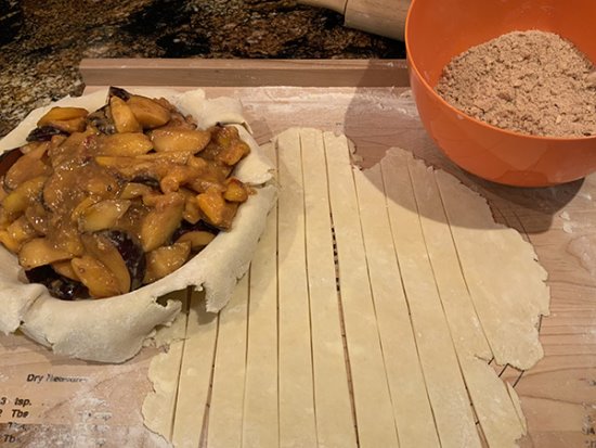 It's definitely fruit pie season, and with peaches and plums beautifully ripe at the produce markets, this is a good one to make right now. I make a lot of pies, but there are two new things I did with this pie that I'd never done before. First of all, I combined fresh peaches and plums, along with brown sugar and spice, and then topped the fruit mixture with both a crumb topping and a lattice crust. This serendipitous combination was indescribably delicious. It was also a very pretty pie with both the peach color and dark purplish red of the plums. Don't feel that you need to do both, one crust or the other would be plenty, but if you have time, it's such a treat to have both!