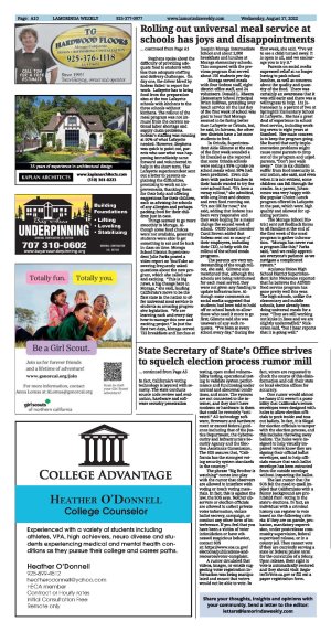 Parents on social media expressed relief at no longer having to pack school lunches, as well as concerns about the quality and quantity of the food. There was certainly an awareness that it was still early and there was a willingness to help. Liz Johannesen is a parent of two at Springhill Elementary School in Lafayette. She has a great deal of experience in school food service, including working seven to eight years at Stanford. Her main concern is to keep the program going. She feared that early implementation problems might cause some parents to drop out of the program and urged parents, "Don't just walk away." One in six children suffer from food insecurity in our nation, she said, and even when it is not evident, some children can fall through the cracks. As a parent, Johannesen was very happy with the popular Choice Lunch program offered in Lafayette in the past, which were high quality and allowed for upsizing portions.