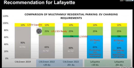 | | Image provided | | | | | | With electric vehicle popularity on the rise, finding locations to charge these vehicles - especially on multi-family and commercial properties - will become paramount. The Lafayette Planning Commission in a special meeting held on Aug. 22 discussed a recommendation that the City Council adopt Resolution 2022-13 that amends Title 6 of the Lafayette Municipal Code, and closely mirrors the State of California's upcoming 2022 CALGreen Building Code revisions that go into effect Jan. 1, 2023. The standards in the CALGreen update recently signed into law by Gov. Gavin Newsom establish that EV charging in new multi-family projects, whether they propose less than 20 or more than 20 dwelling units, are based on certain percentages of the required parking metrics and have varying degrees of EV charging speed (Level 1 and 2) and states of readiness (EV Capable, EV Ready, or EV Charger Installed).