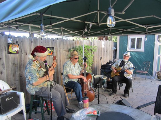 The audience often comprises of seniors, cyclists on a coffee break, young teens, kids with their parents, and dogs on leashes (partaking of Si Si's free water -- not coffee). During a recent concert, one audience member happily knitted while enjoying standards from the 1920s to 1950s. Strauss calls their musical style "exotica."