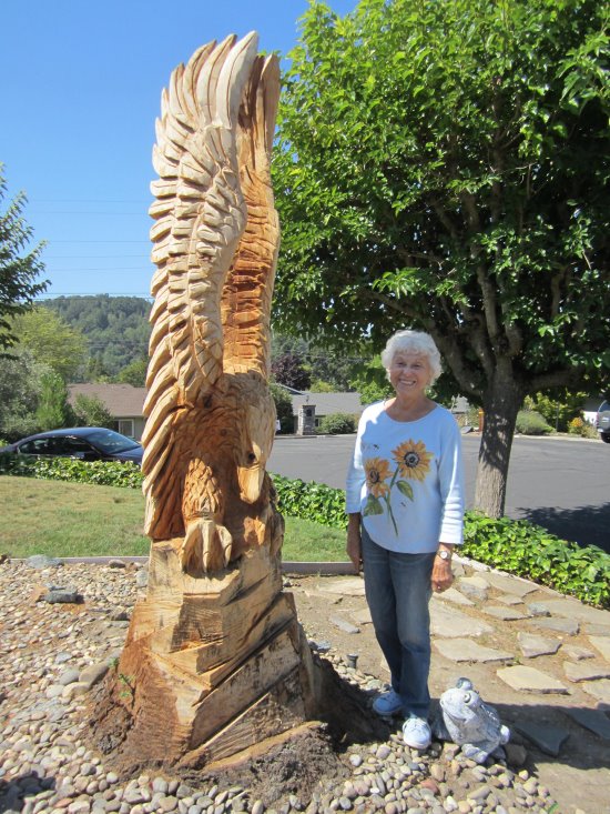 Owner Dolores Austin is dwarfed by her new redwood eagle sculpture Photo Vera Kochan