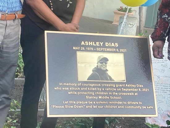 On Friday, Sept. 2 nearly 100 Lafayette residents, city officials, friends and family gathered in downtown Lafayette to remember Dias and bear witness to the unveiling of a plaque in his honor. The plaque reads: `In memory of courageous crossing guard Ashley Dias, who was struck and killed by a vehicle on September 8, 2021 while protecting children in a crosswalk in front of Stanley Middle School. Let this be a solemn reminder of drivers to please slow down and let our children and community be safe.'