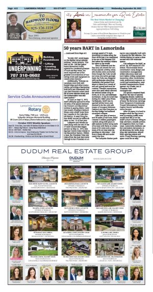| Published September 28th, 2022 | BART celebrates 50 years with two of its stations in Lamorinda | | By Vera Kochan |  | BART's Lafayette and Orinda stations celebrate 50 years of service. Photo Vera Kochan | Although the official year when Bay Area Rapid Transit first began revenue service was 1972, the concept began nearly six decades earlier.