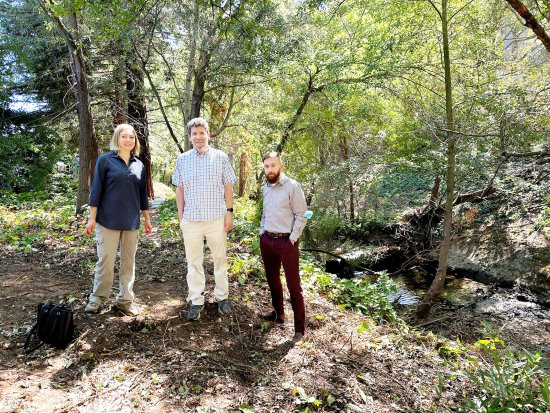 | | Orinda Vice Mayor Inga Miller, Director of Planning Drummond Buckley, and Assistant Planner Darin Hughes take a moment on Oct. 5 to admire the work undertaken by the Friends of Orinda Creeks at San Pablo Creek in downtown Orinda. Photo Sora O'Doherty | | | | | | Where there was old, broken concrete disfiguring San Pablo Creek as it runs through downtown Orinda, there are now three beautiful rock weirs, that create pools where fish can hang out and a wonderful stretch of natural serenity. The work was undertaken by the Friends of Orinda Creeks, which raised the approximately $100,000 required for the removal of the broken concrete channel and the installation of the rock weirs According to FOC board member Michael Bowen, the weirs operate as grade control structures intended to maintain the channel at approximately the same elevation as it was at the beginning of the project.