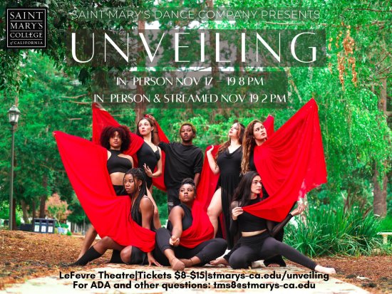 This showcase is produced, performed and choreographed by the Dance Program's Senior Class of 2023:?Faith Alexis, Sofia Amador, Trinity R Boykin, Rochelle Demelo, Sev Fisher, Andrio Jordan Fong, Olivia Rose Grimes, Alexa Janezell, Elena Prisco, and features a new work by guest artist and alumna?Micah Sallid.??According to the Saint Mary's website, "Unveiling"?is a collective dance show that is motivated by the idea of finding grounding and balance within the dance community amidst readjusting from the Covid-19 pandemic. "Returning to campus this fall and reflecting on the shared experiences of the last few years, these emerging choreographers are exploring concepts of familial warfare, changing love, women's rights, time, self divinity, power within marginalization, religious oppression, homesickness, and the instability of dance spaces."